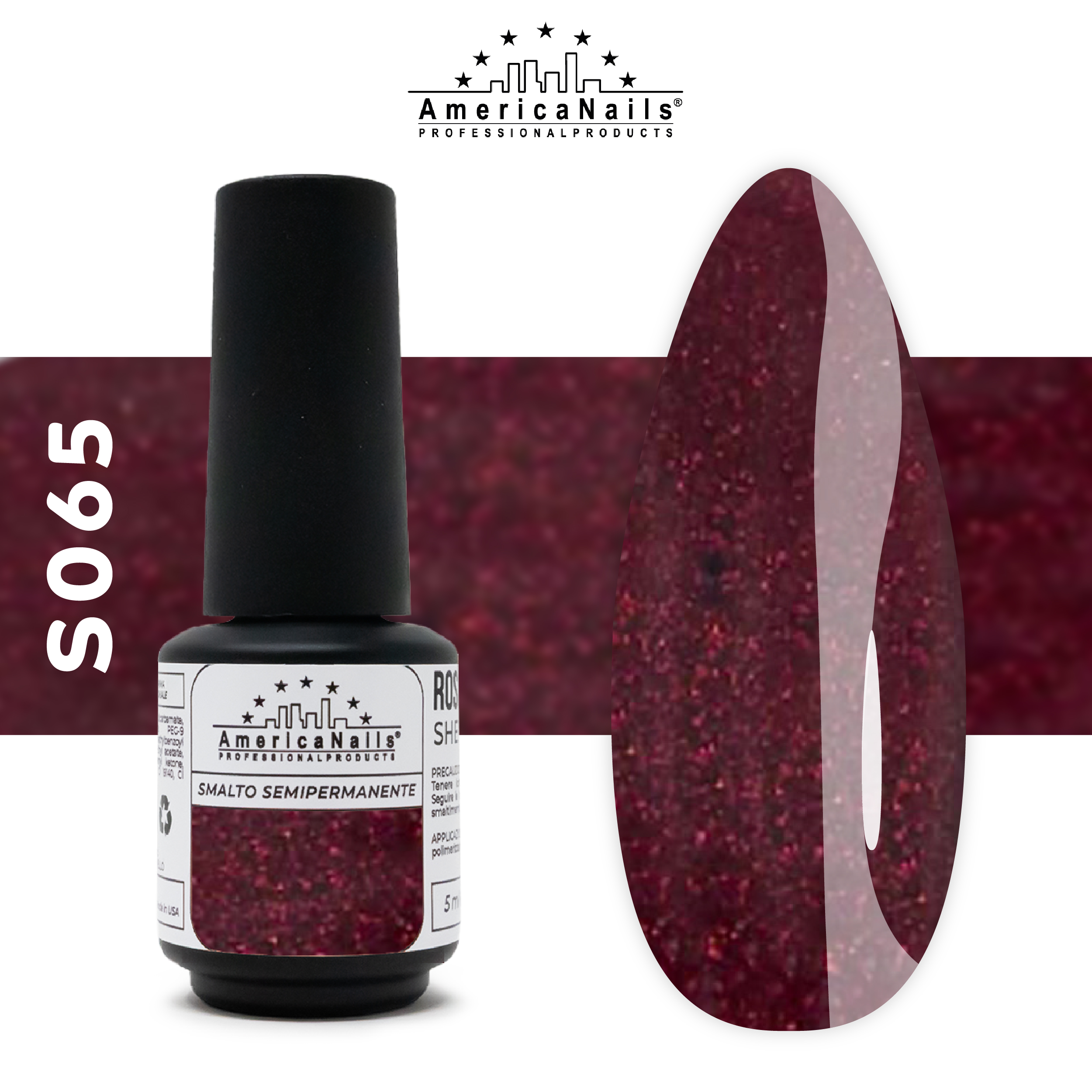 Prodotto Tpo Free. Colore bordeaux tendente al viola con finissimi glitter rossi, coprente. Si consiglia il Base/Top di AmericaNails Twin Base o la base rinforzata Builder Soak Off e il sigillante Top Repair.